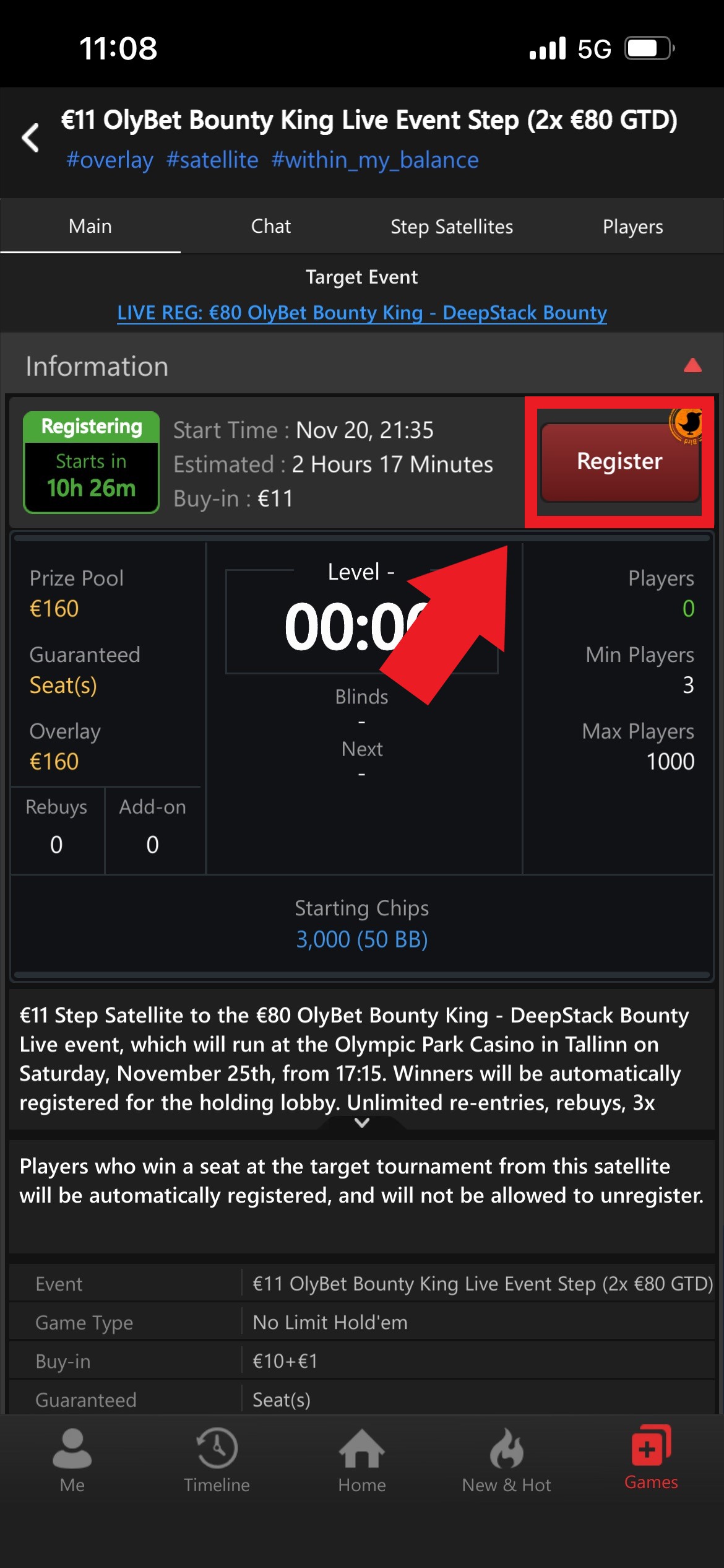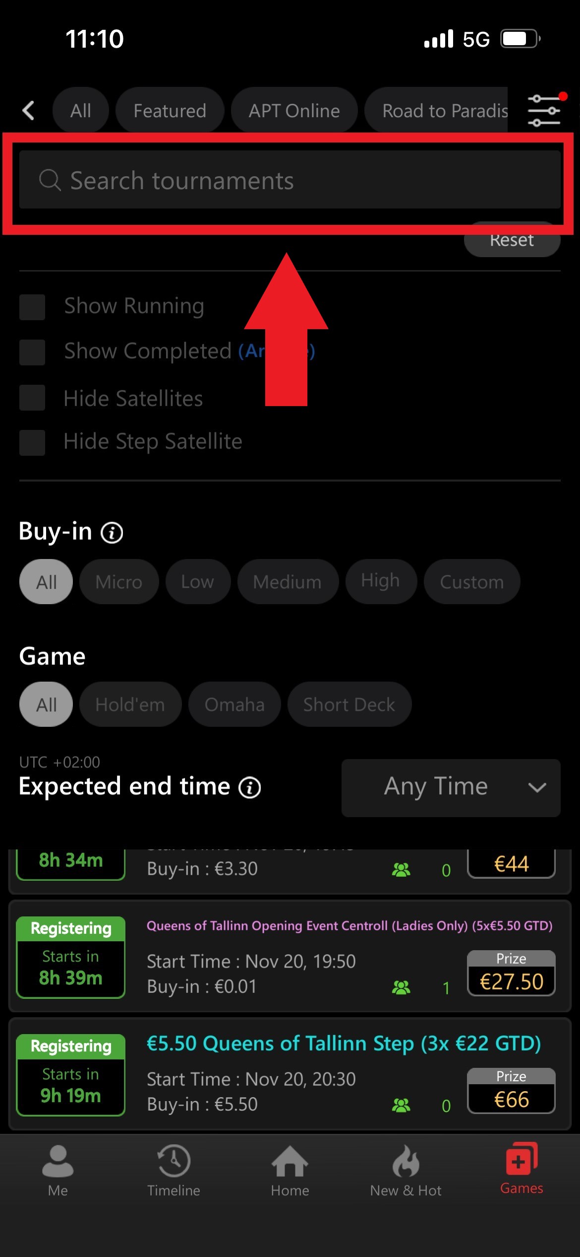 4. Samm: Otsi üles soovitud turniir ilmunud nimekirjast või sisesta turniiri nimi otsinguribale (otsinguriba leiad, klõpsates seadete ikoonil üleval paremas nurgas).